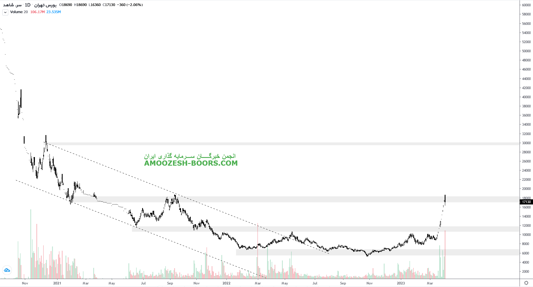 قیمت سهم ثشاهد پس از خروج از کانال نزولی درازمدت و کف سازی در ناحیه ۶۲۰ تومان وارد روند صعودی شده و با شکست مقاومت ۱۱۰۰ تومان رشد خود را تا ناحیه مقاومتی ۱۸۰۰ تومان ادامه داده است. در صورت شکست ناحیه مقاومتی ۱,۸۰۰ تومان و تثبیت، مقاومت بعدی سهم ثشاهد ناحیه 3000 تومان در نظر گرفته خواهد شد همچنین در صورت اصلاح اولین حمایت سهم ثشاهد ناحیه ۱۱۰۰ تومان در نظر گرفته شده است.