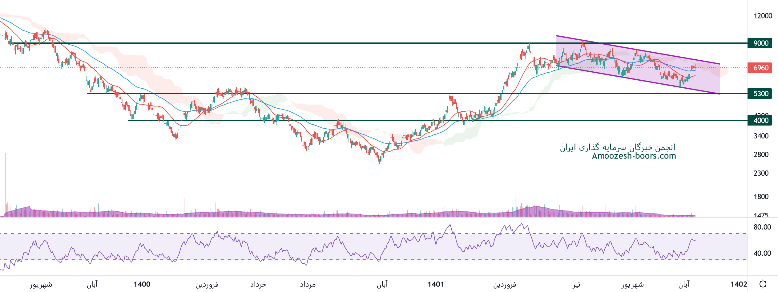 بر اساس نمودار تکنیکال نماد ثنوسا قیمت در یک میکرو کانال نزولی در حال نوسان بوده و مقاومت سقف کانال را دارا میباشد، بهترین محدوده برای سیگنال ورود ثنوسا محدوده 5300 ریال ارزیابی میگردد، در نگاه بد بینانه و شکست این کانال محدوده حمایت بعدی سهم ثنوسا 4000 ریال میباشد، همچنین مقاومت بعدی ثنوسا 9000 ریال میباشد.