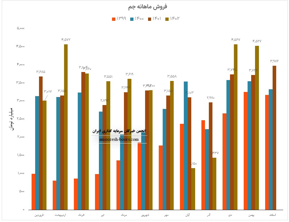 فروش آذر ماه سال 1402 سهم جم 1436.9 میلیارد تومان گزارش شده است که از این درآمد 92% آن از محل فروش داخلی و مابقی از طریق فروش صادراتی تامین گردیده است، تغییرات درآمدی جم به شرح زیر میباشد: