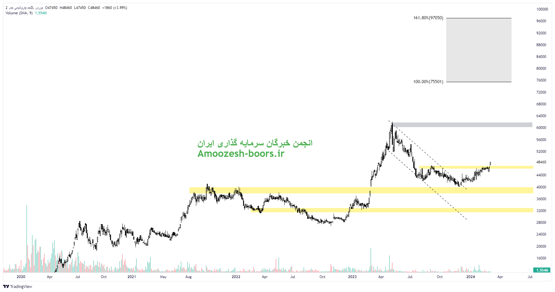 قیمت سهم جم با عبور موفقیت آمیز از مقاومت ناحیه ۴۶۰۰۰ ریال میتواند با تایید پولبک به این ناحیه شکسته شده حرکت خود را به سمت مقاومتهای 61000، 75000 و 97000 ریال در میان مدت ادامه دهد. اما در صورت عدم تایید پولبک و برگشت مجدد سهم به زیر ناحیه حمایت ۴۶۰۰۰ ریال، حمایت بعدی سهم جم ناحیه ۳۸۰۰۰ ریال در نظر گرفته خواهد شد.