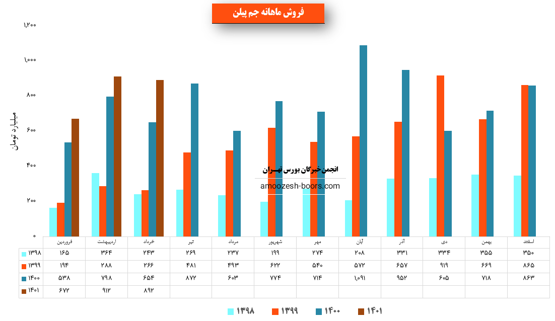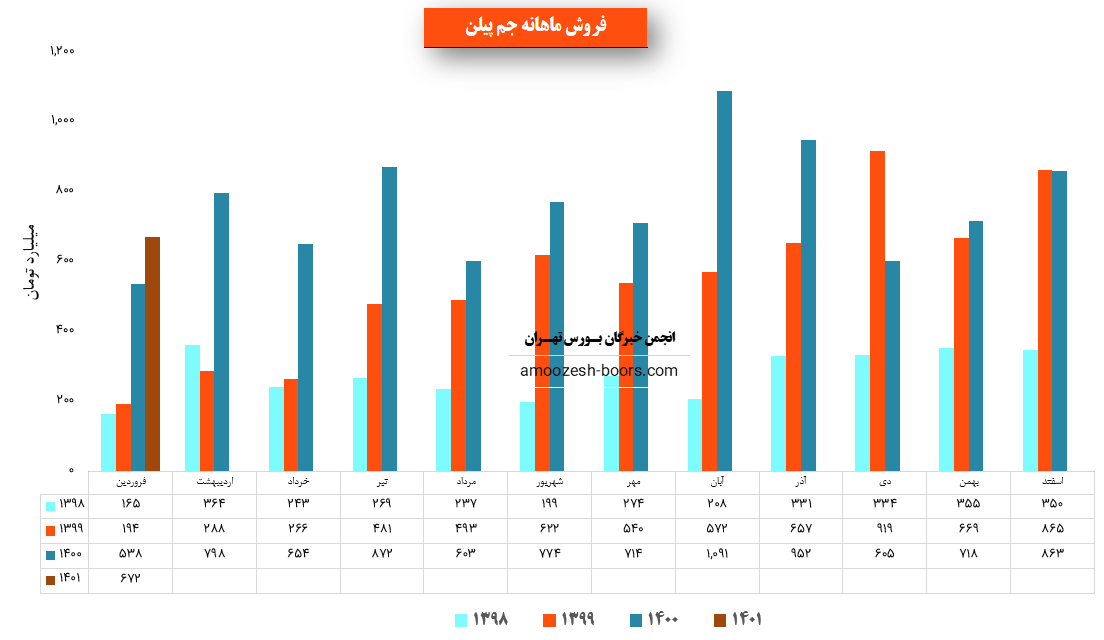 جم پیلن در فروردین ماه حدود ۱۸ هزار و ۳۰۰ تن محصولات خود را به فروش رساند این میزان در مقایسه با حجم فروش اسفند ماه حدود ۲۲ % کاهش پیدا کرده است.