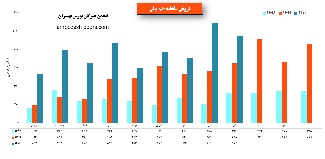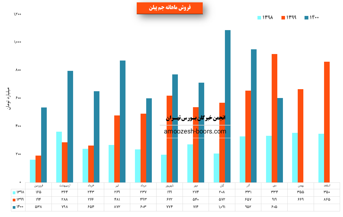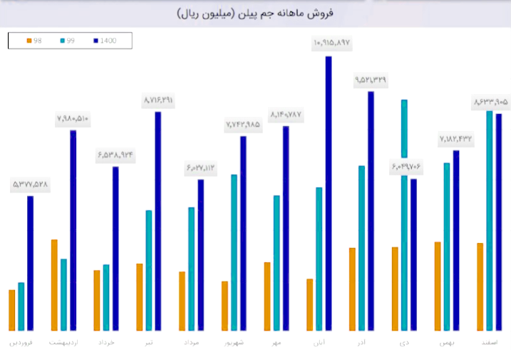 جم پیلن در دی ماه 1400 مبلغ 605 میلیارد تومان درامد داشته که این میزان نسبت به ماه گذشته 36% افت و همچنین نسبت به مدت مشابه سال گذشته 34% رشد پیدا کرده است!