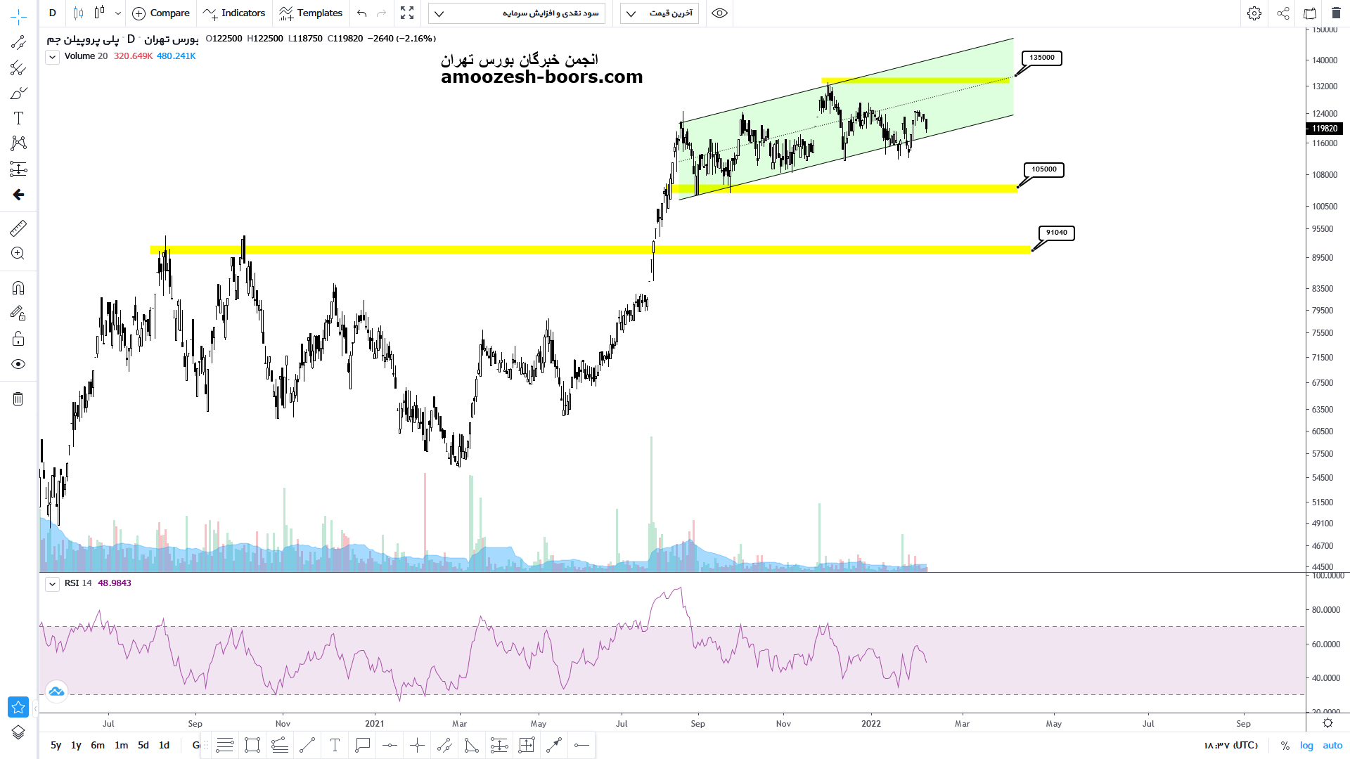 درصورت شکست حمایت کف کانال صعودی میتواند تا محدوده حمایتی 10000 تومان و سپس در صورت شکست این محدوده حمایتی تا محدوده 9000 تومان نیز نزول خود را ادامه دهد .