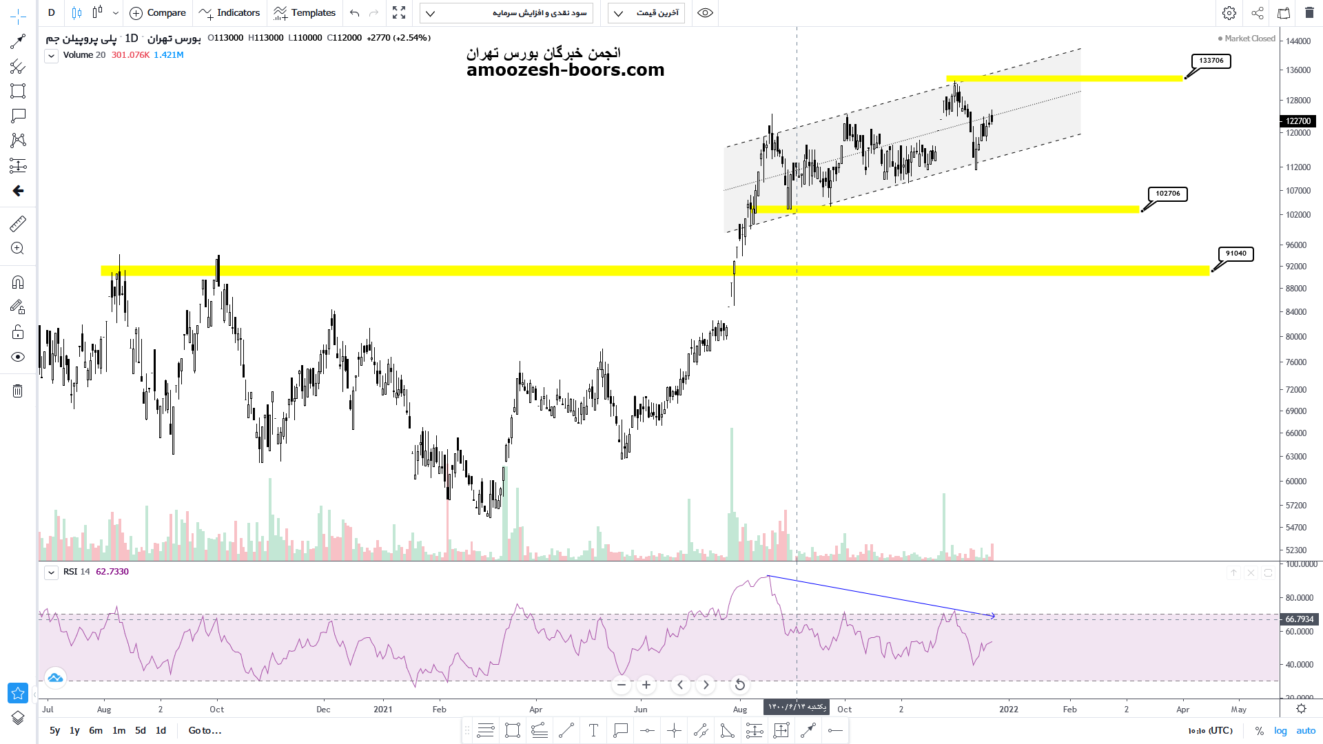 قیمت سهم جم پیلن درون یک کانال صعودی 5 ماهه در حال نوسان است که پس از برخورد به کف کانال و رشد 10 درصدی به ماومت میدلاین کانال برخورد کرده است که در صورت شکست آن میتواند تا مقاومت محدوده 13500 الی 14000 تومان صعود کند