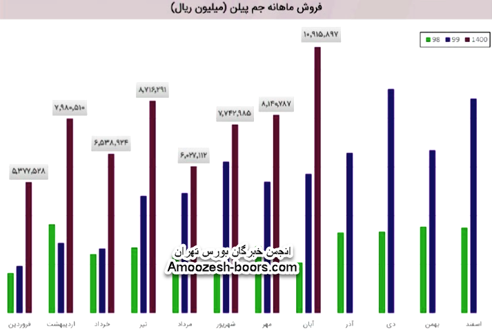 1- نماد جم پیلن در خصوص 6 ماهه دوم سال 1400 مبلغ 2831 میلیارد تومان پیشبینی فروش داشته که در مقایسه با فروش 6 ماهه نخست افت 33 درصدی فروش پیشبینی شده است.
