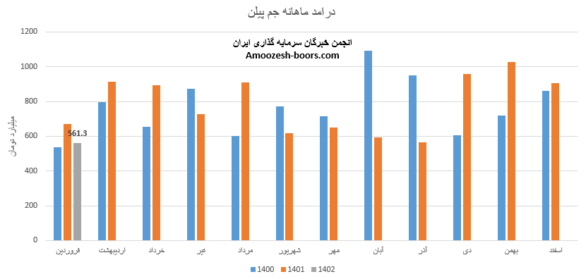 درآمد فروردین ماه سال 1402 نماد جم پیلن 561.3 میلیارد تومان ثبت شده است، درآمد جم پیلن در فروردین ماه تماما از طریق فروش داخلی تامین شد، این رقم نسبت به مدت مشابه 16% و نسبت به ماه قبل 38% کاهشی شده است، پر فروش ترین محصول سهم جم پیلن پلی پروپیلن با بسته بندی پالت میباشد که نرخ فروش این محصول بدون تغییر خاصی نسبت به ماه قبل گزارش شده است، اما مقدار فروش در مقایسه با ماه قبل 38% کاهش داشته است.