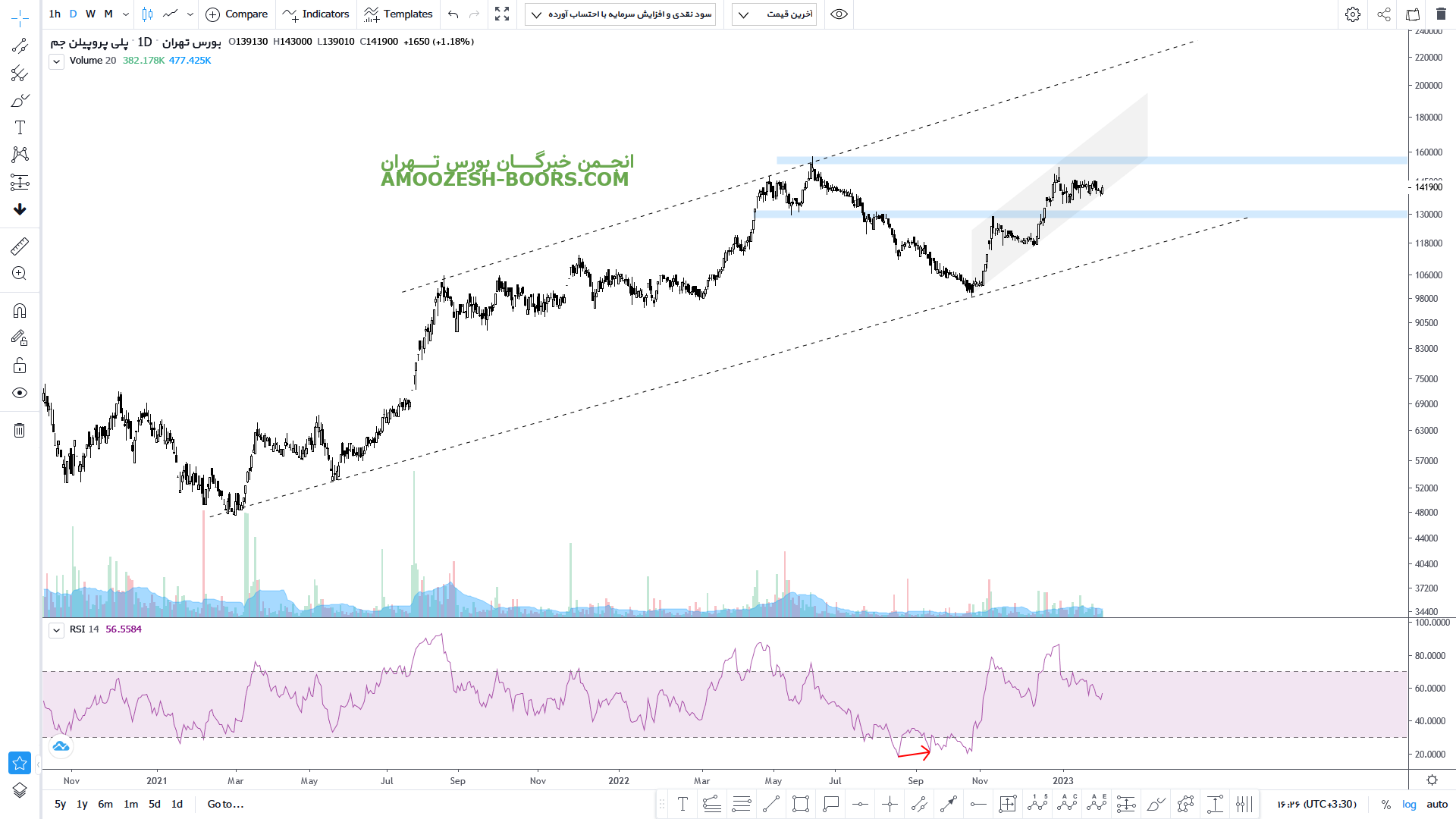 قیمت سهام جم پیلن در قالب یک کانال صعودی کوتاه مدت در حال رشد می باشد لذا در صورت حفظ ناحیه حمایتی کف کانال میتواند رشدی را تا ناحیه مقاومتی سقف کانال یعنی ناحیه ۱۸ هزار تومان داشته باشد همچنین در صورت از دست رفتن این ناحیه حمایتیt حمایت ۱۳ هزار تومان اولین حمایت سهم جم پیلن در نظر گرفته شده است.
