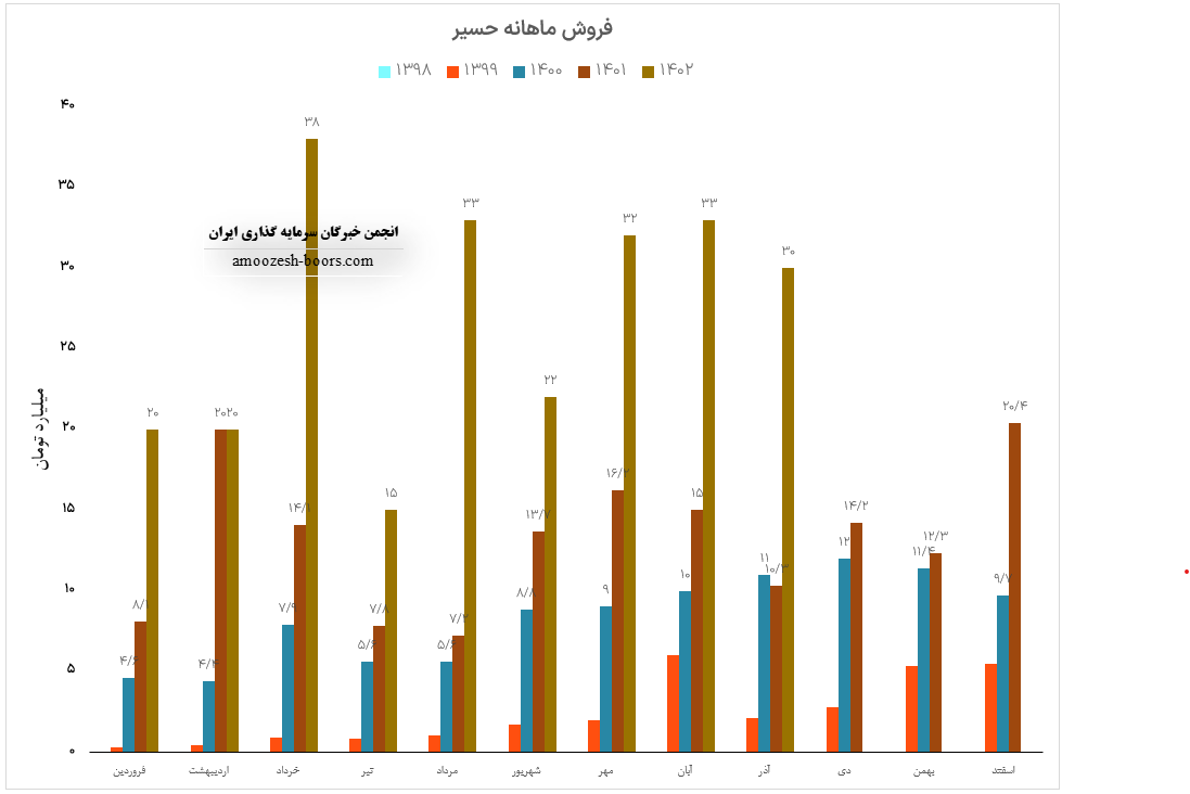 درآمد آبان ماه سال 1402 سهم حسیر 32.6 میلیارد تومان بوده است که در مقایسه با ماه گذشته 1% رشد داشته است.