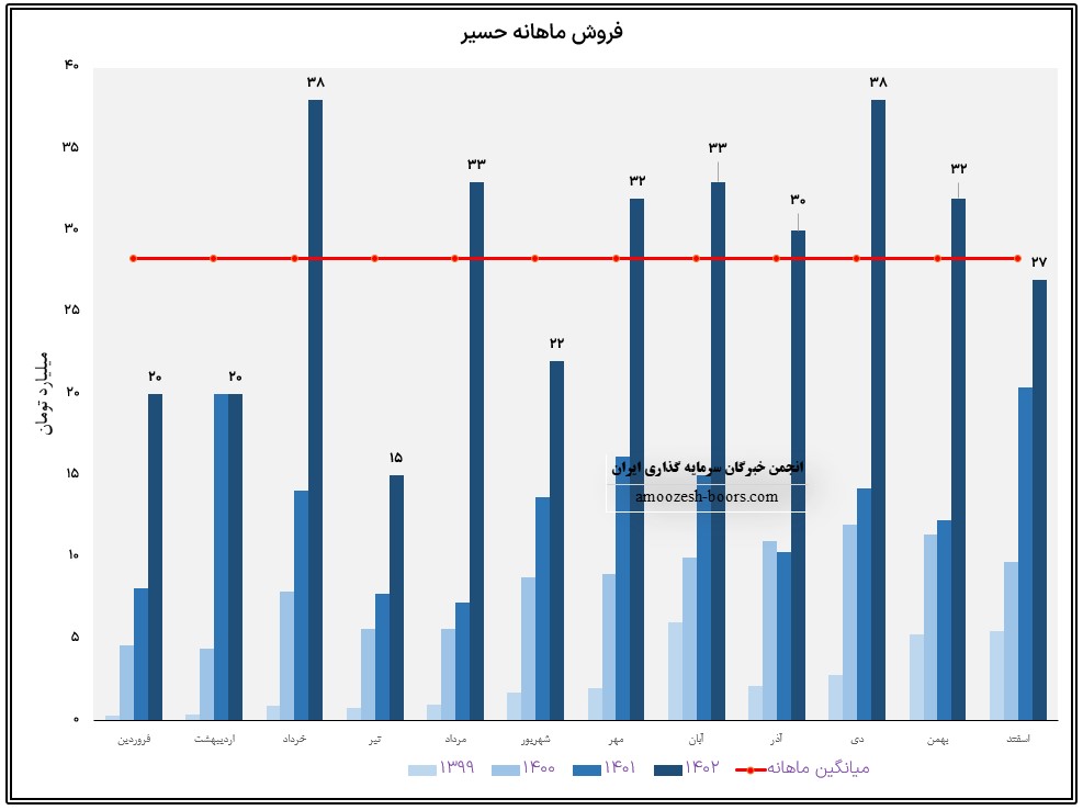 نماد حسیر طی 11 ماه به فروش 349.2 میلیارد تومان دست یافته است که در مقایسه با مدت مشابه افزایش 152 درصدی داشته و طی این مدت 119% بیشتر از کل درآمد سال گذشته درامد زایی داشته است.