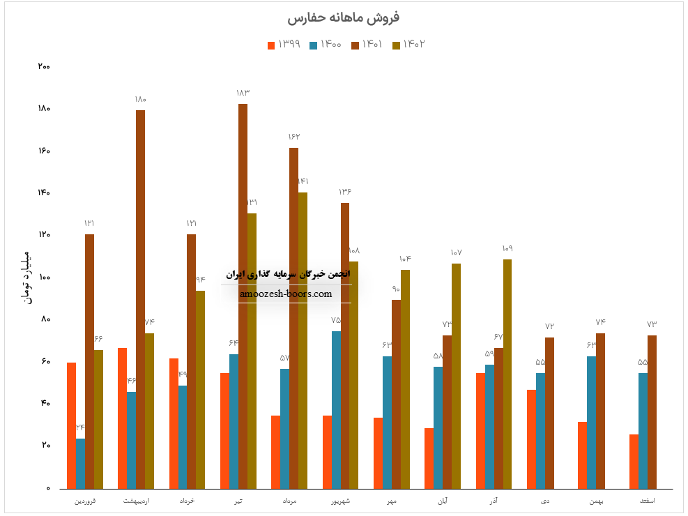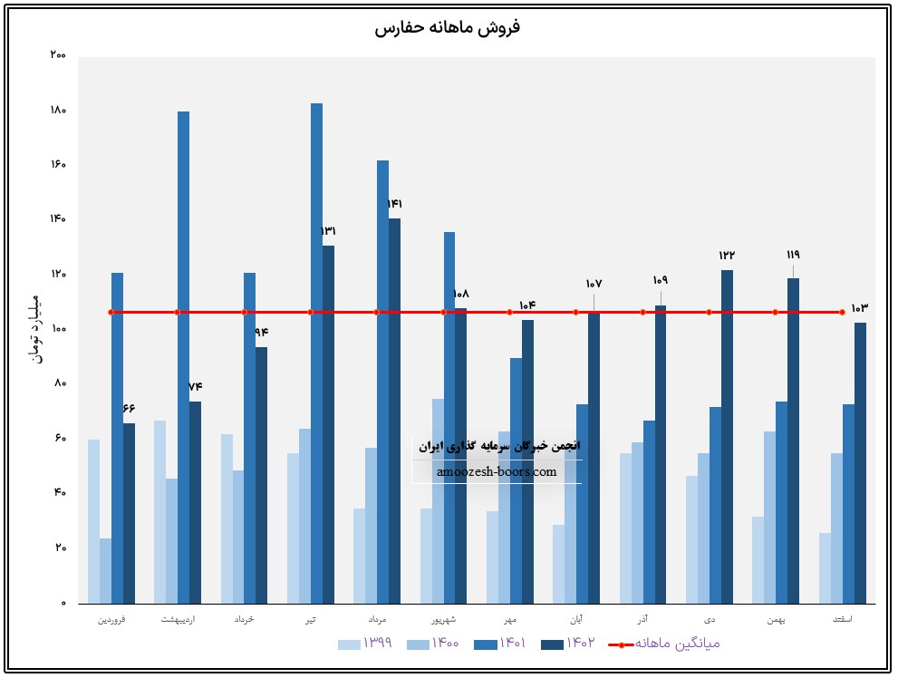 نماد حفارس (شرکت بین المللی حمل و نقل خلیج فارس) در اسفند ماه سال 1402 حدود مبلغ 103 میلیارد تومان درآمد داشته که این میزان در مقایسه با ماه گذشته 13% افت و همچنین در مقایسه با مدت مشابه سال گذشته 41% افزایش پیدا کرده است.