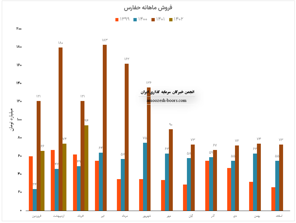 فروش ماهانه نماد حفارس 140.9 میلیارد تومان گزارش شده است که این رقم در مقایسه با ماه گذشته و متوسط ماهانه به ترتیب با افزایش 7 و 54 درصدی همراه بوده است.