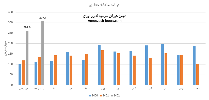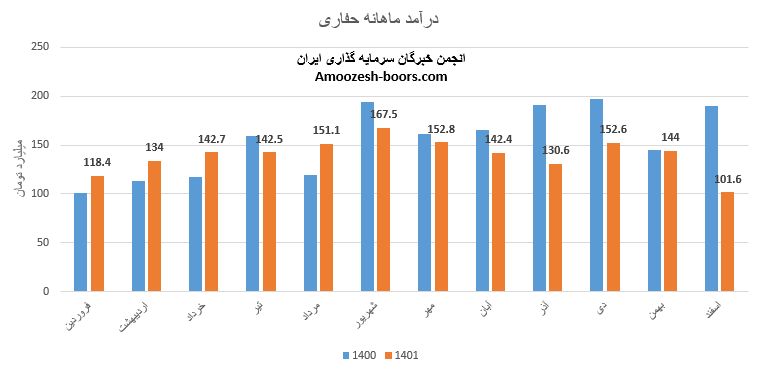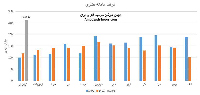 نماد حفاری در زمستان عملکرد خوبی نداشت و آخرین ماه از سال مالی را با فروشی معادل 101.6 میلیارد تومان به اتمام رساند، درآمد اسفند ماه سهم حفاری نسبت به دوره های زیر کاهشی بوده است: