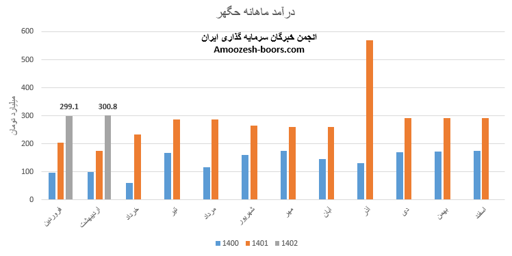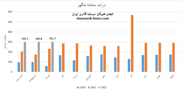 نماد حگهر با ثبت فروش 335 میلیارد تومانی گزارش ماهانه تیر ماه را به پایان رساند، فروش سهم حگهر در مقایسه با ماه گذشته و متوسط ماهانه 11% رشد داشته و نسبت به مدت مشابه نیز از افزایش 17 درصدی برخوردار شده است، مجموع عملکرد 4 ماهه سهم حگهر در مقایسه با مدت مشابه افزایش 42 درصدی داشته است و طی این مدت 36% از کل درآمد سال گذشته تحقق یافته است.