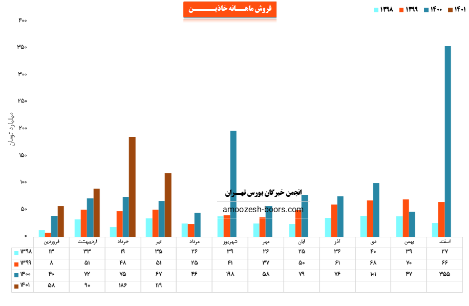سهم خاذین در تیر ماه حدود بیش از 24 هزار دست از محصولات خود را به فروش رسانده که این میزان در مقایسه با حجم فروش ماه گذشته خود حدود 13% کاهش پیدا کرده است.