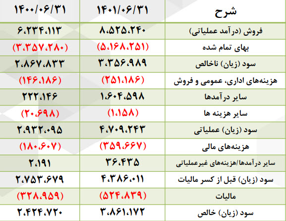 سود ناخالـص: 210 میلیارد تومان که نسبت به دوره مشابه گذشته 72% افزایش یافته است.