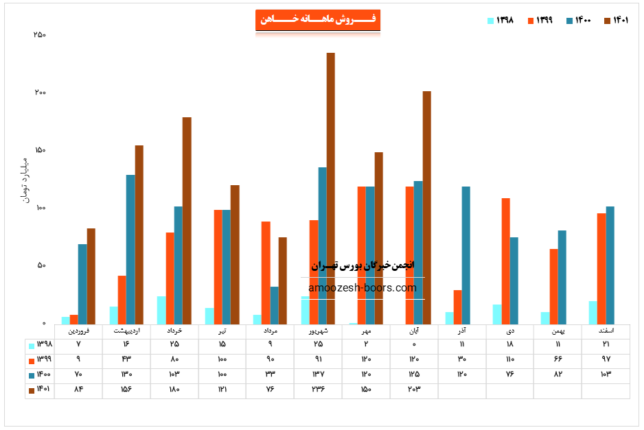 نماد خاهن در مرداد ماه حدود بیش از 843 تن از محصولات خود را به فروش رساند که این میزان در مقایسه با ماه گذشته 50% کاهش پیدا کرده است.