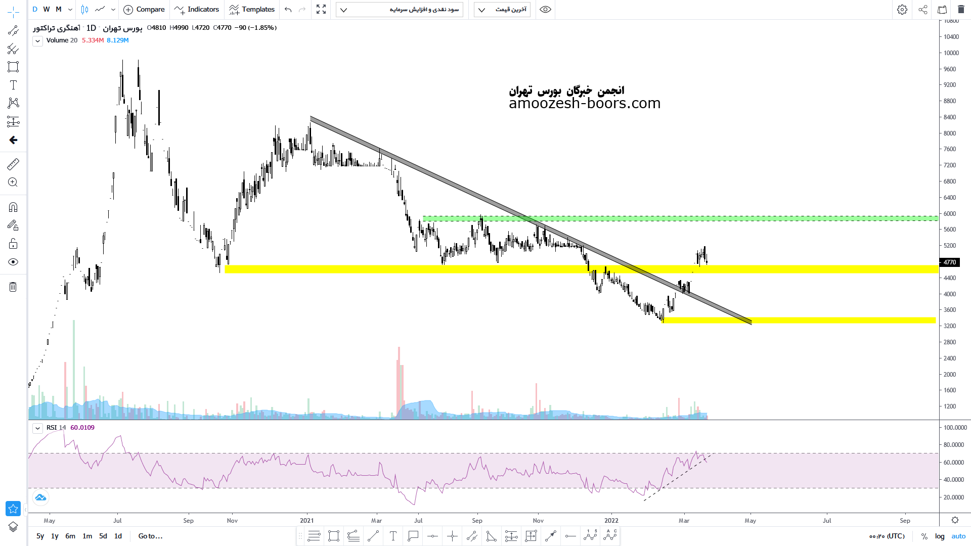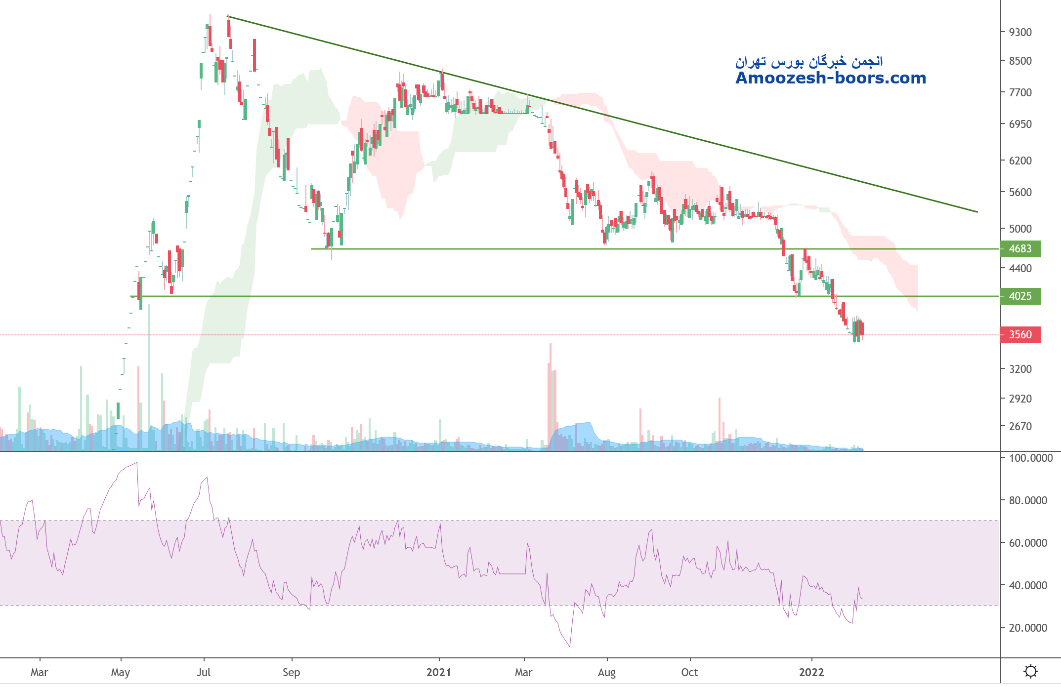 با توجه به رشد ۵۰ درصدی قیمت ازکف ۳۳۰ تومان و همچنین شکست دو مقاومت مهم خط روند نزولی و مقاومت محدوده ۴۸۰ تومان انتظار اصلاح زمانی را از قیمت داریم لذا این اصلاح می تواند باعث نزول قیمت تا محدوده حمایتی ۴۰۰ تومان نیز شود. در صورت قیمت مقاومت محدوده ۶۰۰ تومان را بر سر راه خود میبیند که در صورت شکست آن میتواند تا محدوده ۷۲۰ تومان نیز رشد خود را ادامه دهد.