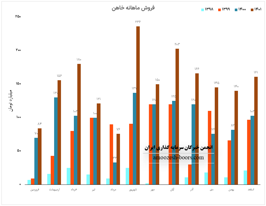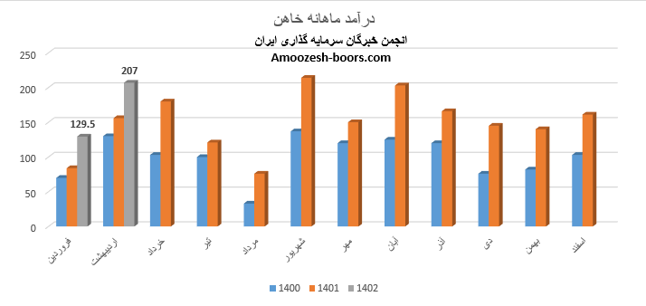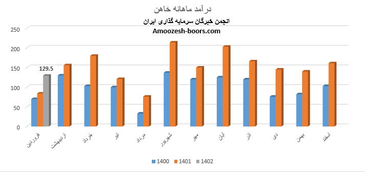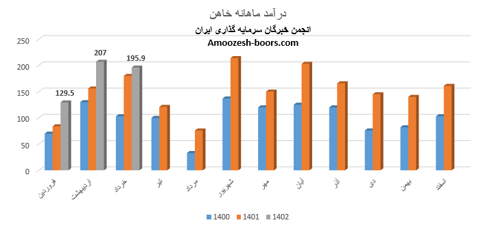 نماد خاهن با افزایش 54 درصدی فروش نسبت به مدت مشابه درآمد خود را در فروردین ماه سال 1402 129.5 میلیارد تومان گزارش نموده است که در مقایسه با ماه گذشته افت 20 درصدی داشته است، علت افت درآمد نسبت به ماه گذشته، کاهش 33 درصدی مقدار فروش ارزیابی میگردد، چرا که نرخ فروش این محصول نسبت به ماه گذشته افزایش 24 درصدی را تجربه نموده است.