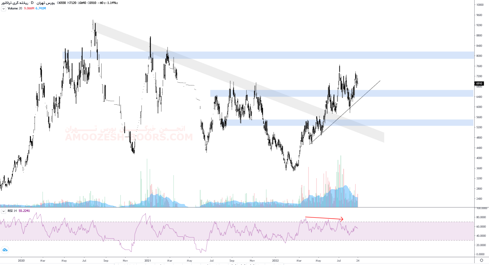قیمت نماد ختراک پس از نزدیک شدن به ناحیه مقاومتی ۸۰۰ تومان با ایجاد واگرایی منفی در اندیکاتورها و کاهش قدرت خریداران، نرسیده به این ناحیه مقاومتی وارد فاز اصلاحی شده و اکنون نیز ناحیه حمایتی ۶۵۰ تومان را پیش روی خود دارد که در صورت حمایت می تواند با هدف تست دوباره مقاومت ۸۰۰ تومان رشد کند اما در صورت عدم حمایت و تمایل قیمت برای ریزش بیشتر محدوده حمایتی ۵۵۰ تومان می تواند سد راه قیمت از ریزش بیشتر شود.
