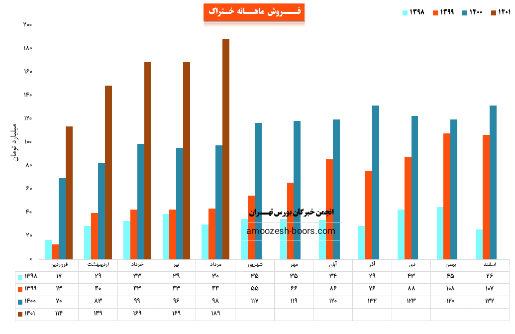نماد ختراک در مرداد ماه حدود بیش از 4800 تن از محصولات خود را به فروش رسانده که این میزان در مقایسه با حجم فروش ماه گذشته خود حدود 8% کاهش پیدا کرده است.