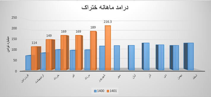 نماد ختراک (شرکت ریخته گری تراکتور سازی ایران) در دوره یک ماهه منتهی به 31 شهریور ماه 1401، مبلغ 216.3 میلیارد تومان درآمد داشته است که نسبت به ماه قبل 14% افزایش و نسبت به میانگین ماه های قبل 37% افزایش داشته است.