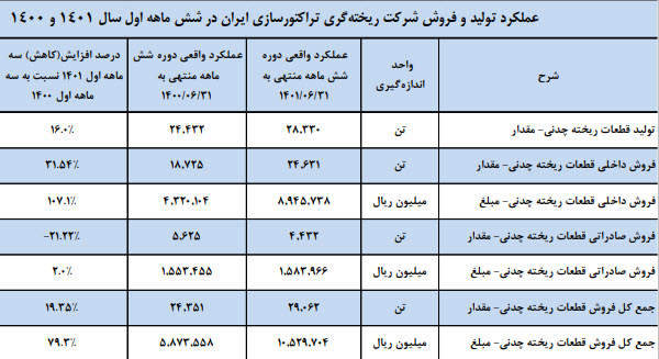 EPS محقق شده نماد ختراک (شرکت ریخته گری تراکتور سازی ایران) در دوره 6 ماهه 854 ریال گزارش شده است که این رقم نسبت به دوره مشابه سال قبل (194%) افزایش داشته است. همچنین سود ناخالص درین دوره نسبت به مدت مشابه سال گذشته 149% رشد، سود عملیاتی 254% رشد، درآمدهای عملیاتی 79% رشد و هزینه های مالی41% افت را تجربه نموده است .باید در نظر داشت در سال مالی 1400 حاشیه سود ختراک برابر 17% بوده که در شش ماهه امسال حاشیه سود به 23% رسیده است.همچنین جدول مقایسه ای عملکرد واقعی دوره شش ماهه اول سال 1401 و اطلاعات دوره قبل در زیر آمده است: