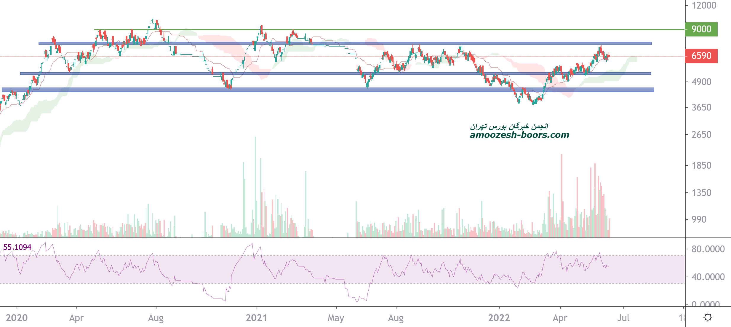 قیمت در محدوده حمایتی 6300 ریال و مقاومتی 7700 ریال رد حال نوسان است،در صورت از دست رفتن حمایت،حمایت بعدی 5400 ریال در نظر گرفته خواهد شد و حد ضرر فعال میگردد و همچنین در صورت تثبیت قیمت و عبور از مقاومت حرکت قیمت تا 9000 ریال محتمل خواهد بود.