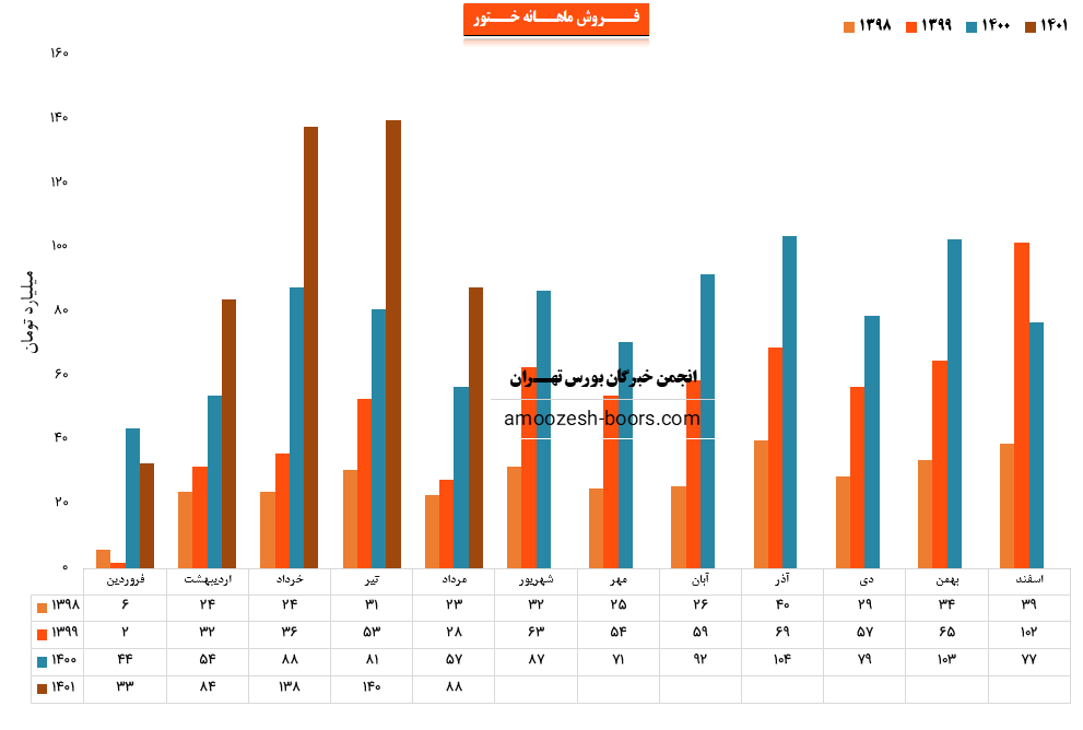 نماد ختور(شرکت رادیاتور ایران) در مرداد ماه سال 1401 حدود مبلغ 88 میلیارد تومان درآمد داشته که این میزان در مقایسه با ماه گذشته 37% کاهش و همچنین در مقایسه با مدت مشابه سال گذشته 54% رشد درآمد پیدا کرده است.