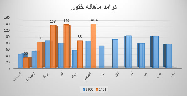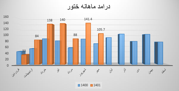 نماد ختور (شرکت رادیاتور ایران) در آبان ماه سال 1401 حدود مبلغ 127 میلیارد تومان درآمد داشته که این میزان در مقایسه با ماه گذشته 20% و همچنین در مقایسه با مدت مشابه سال گذشته 38% رشد درآمد پیدا کرده است.