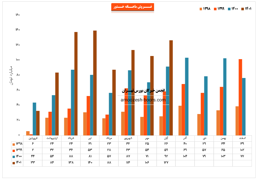 نماد ختور مجموعاً در مرداد ماه 178 هزار کیلوگرم از محصولات خود را به فروش رساند که این میزان در مقایسه با فروش ماه گذشته حدود 37% کاهش پیدا کرده است.
