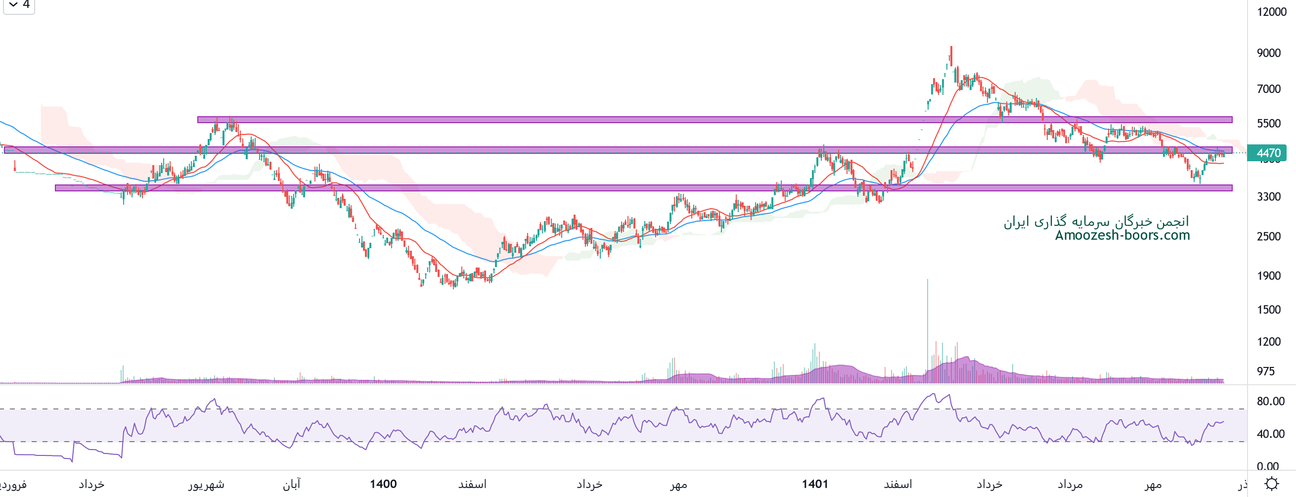در بررسی نمودار تکنیکال نماد ختور، قیمت سهم حدودا 30% رشد داشته است، در حال حاضر مقاومت ختور محدوده 4500 در نظر گرفته خواهد شد، در صورت ادامه دار شدن صعود و عبور قیمت از این محدوده مقاومتی، مقاومت بعدی سهم ختور سطح 5700 ریال در نظر گرفته خواهد شد، همچنین در صورت ورود قیمت به فاز اصلاحی، اولین حمایت ختور محدوده 3500 ریال در نظر گرفته خواهد شد.
