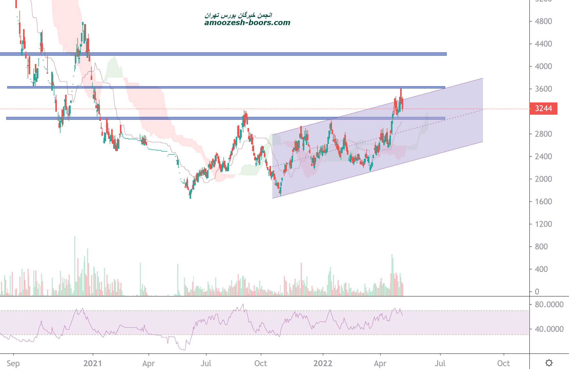 در حال حاضر قیمت درگیر مقاومت های سقف کانال و محدوده استاتیک میباشد در صورت ادامه دار شدن فشار تقاضا و شکستن این دو مقاومت و تثبیت بالای آن حرکت قیمت تا 4200 ریال محتمل خواهد بود و در صورتی که سهم وارد فاز اصلاحی شود اولین و دومین حمایت سهم به ترتیب 3000 و 2900 ریال در نظر گرفته خواهد شد
