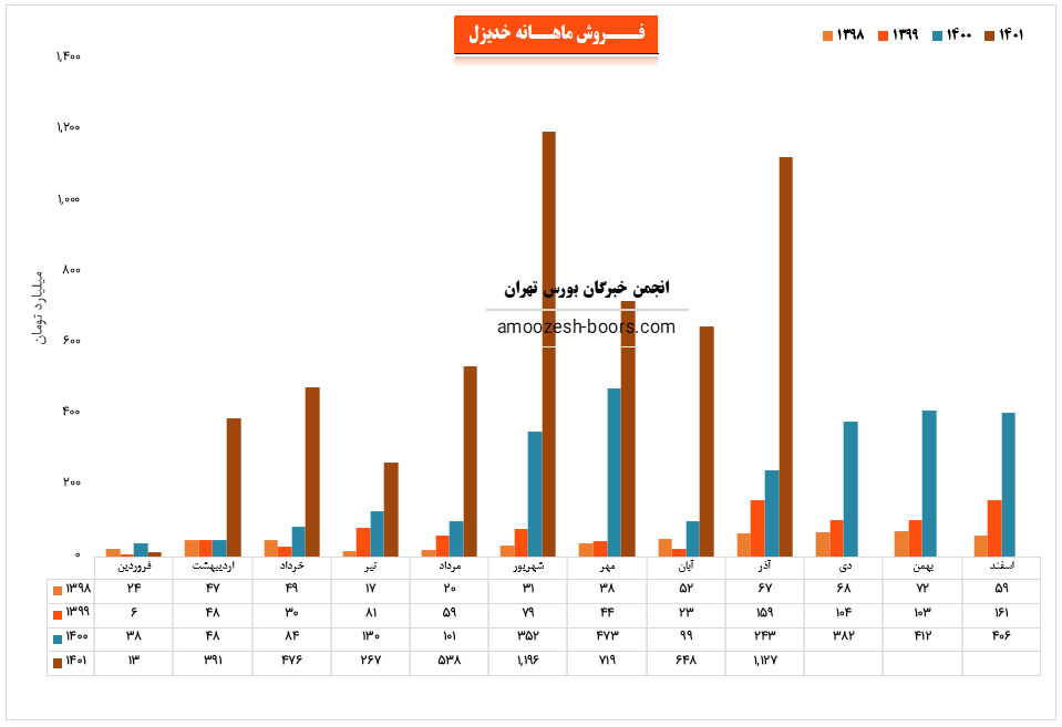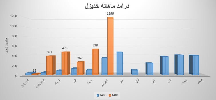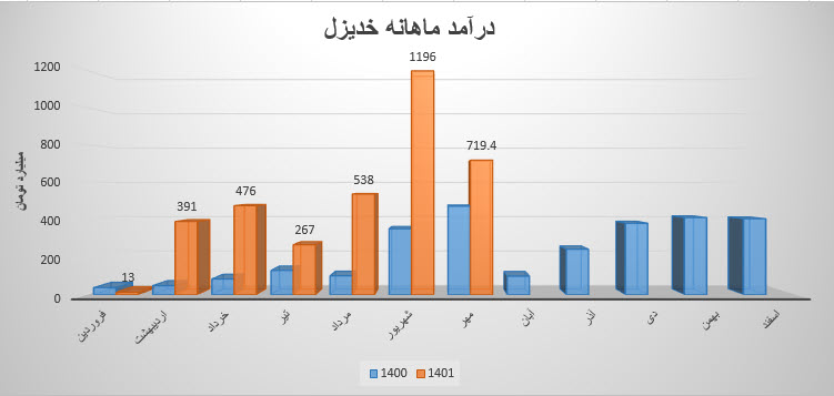 نماد خدیزل (شرکت بهمن دیزل) در آذر ماه ۱۴۰1 حدود مبلغ 1127 میلیارد تومان درآمد داشته که این میزان در مقایسه با ماه گذشته 74% و همچنین در مقایسه با مدت مشابه سال گذشته 364% رشد پیدا کرده است.