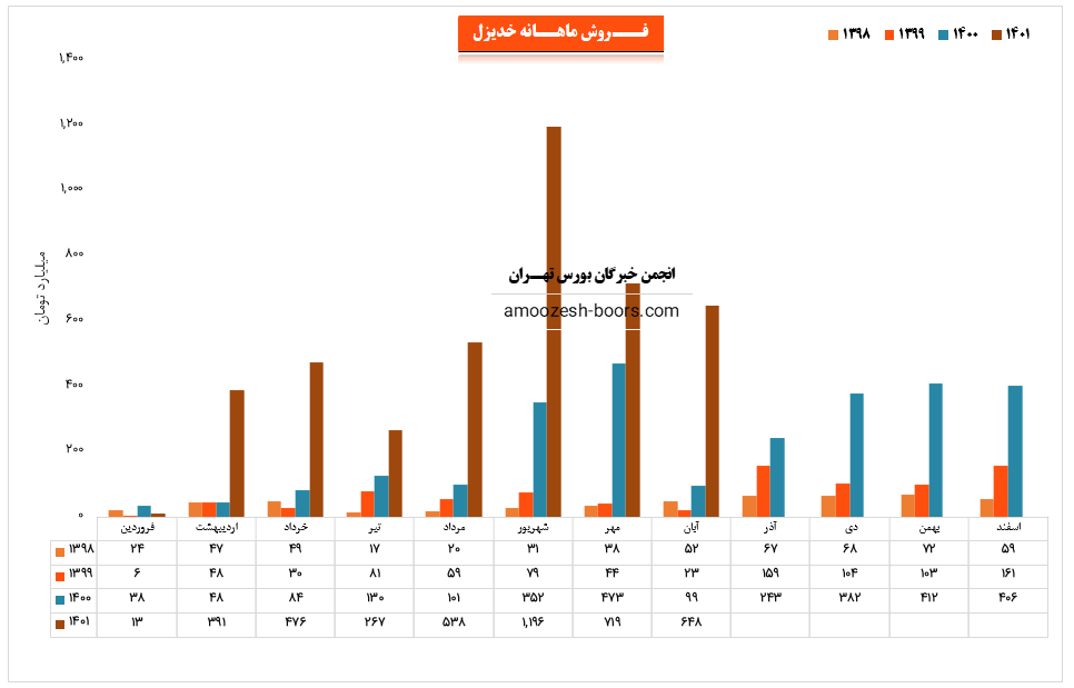 نماد خدیزل (شرکت بهمن دیزل) در گزارش شهریور ماه خود معادل 11,956,297 میلیون ریال از محصولات خود را به فروش رسانده است که نسبت به دوره 1 ماهه مشابه سال قبل 239% افزایش داشته است.