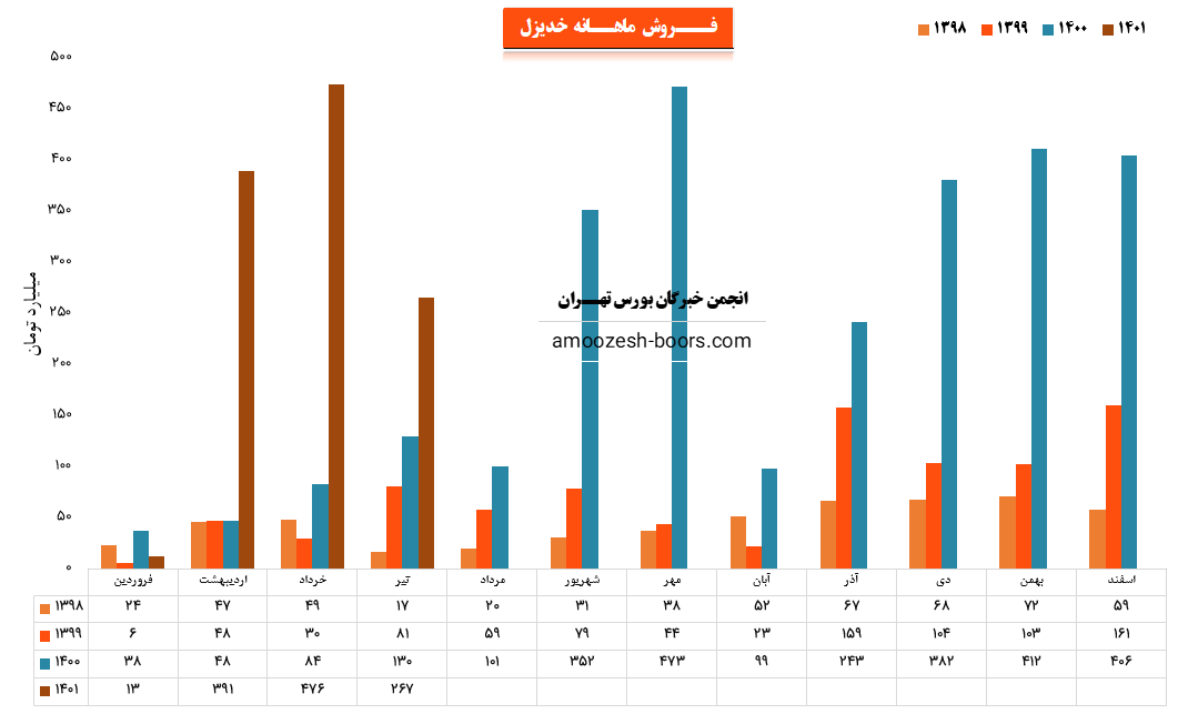 نماد خدیزل (شرکت بهمن دیزل) در مرداد ماه ۱۴۰1 حدود مبلغ 538 میلیارد تومان درآمد داشته که این میزان در مقایسه با ماه گذشته 101% و همچنین در مقایسه با مدت مشابه سال گذشته 433% رشد درآمد پیدا کرده است.