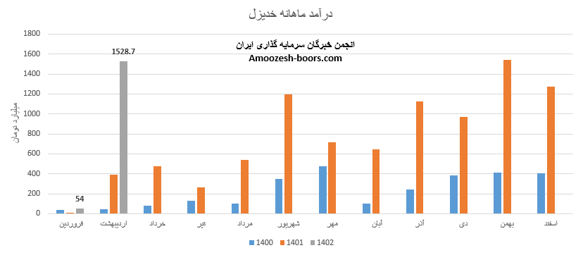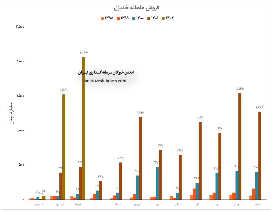 نماد خدیزل (شرکت بهمن دیزل) در خرداد ماه سال 1402 حدود مبلغ 2064 میلیارد تومان درآمد داشته که این میزان در مقایسه با ماه گذشته 35% و همچنین در مقایسه با مدت مشابه سال گذشته 334% رشد پیدا کرده است.