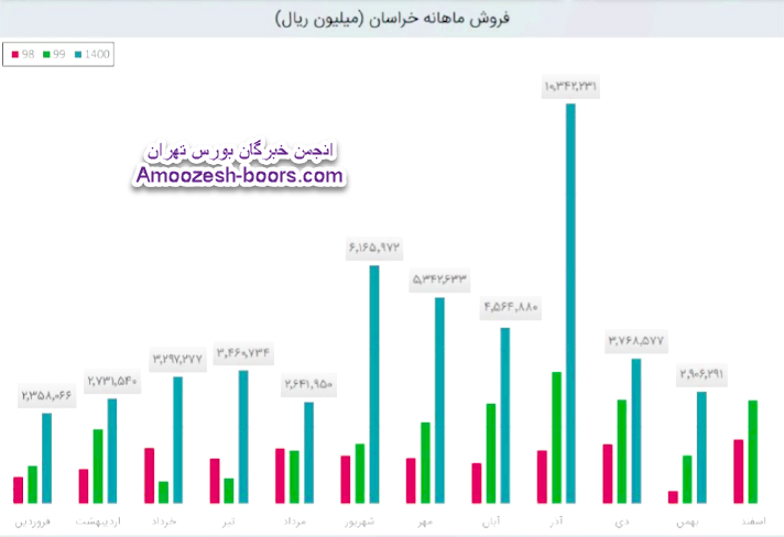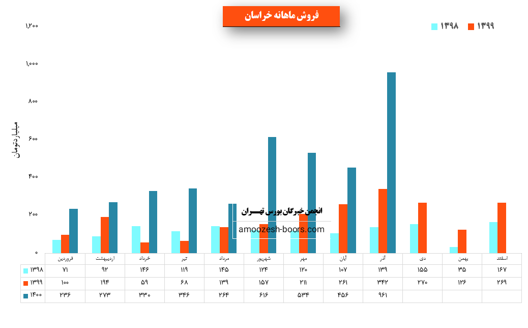 نماد خراسان در اسفند ماه عملکرد بهتری نسبت به دی و بهمن داشت و فروش 5.131 میلیارد ریالی را به ثبت رساند. گرچه این رقم 24 درصد کمتر از میانگین فروش 3 ماهه پاییز است اما در مقایسه با درآمد بهمن ماه رشد 76 درصدی را ثبت کرده است.