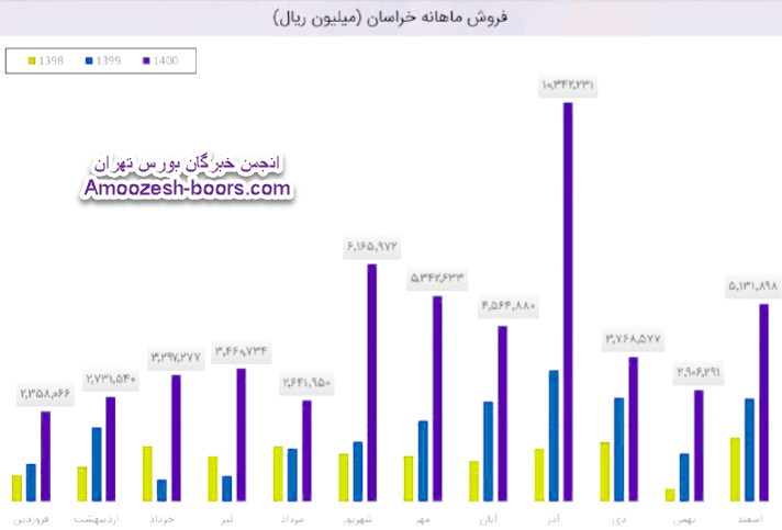 سهم خراسان در آذر مبلغ 332 میلیارد فروش داخلی داشته که نسبت به ماه گذشته 25 درصد رشد پیدا کرده اما در فروش صادراتی عملکرد بهتری را نسبت به فروش داخلی شاهد بودیم بطوریکه خراسان در آذر بیش از 630 میلیارد تومان صادرات داشته که در مقایسه با آبان ماه رشد 230 درصدی را تجربه کرده است.