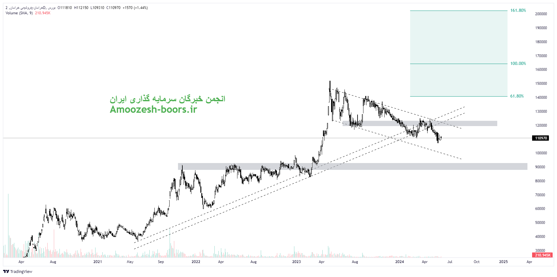 سهم خراسان پس از تایید پولبک به حمایت شکسته شده ناحیه 122000 ریال به اصلاح خود ادامه داده و لذا نزدیکترین حمایت به سهم خراسان ناحیه 90000 ریال در نظر گرفته شده است. همچنین در صورت ایجاد تقاضا در کلیت بازار و صعودی شدن روند سهم خراسان، مقاومتهای 140000 ريال، 165000 ريال و 200000 ریال مهمترین مقاومتهای سهم خراسان به حساب میآیند.