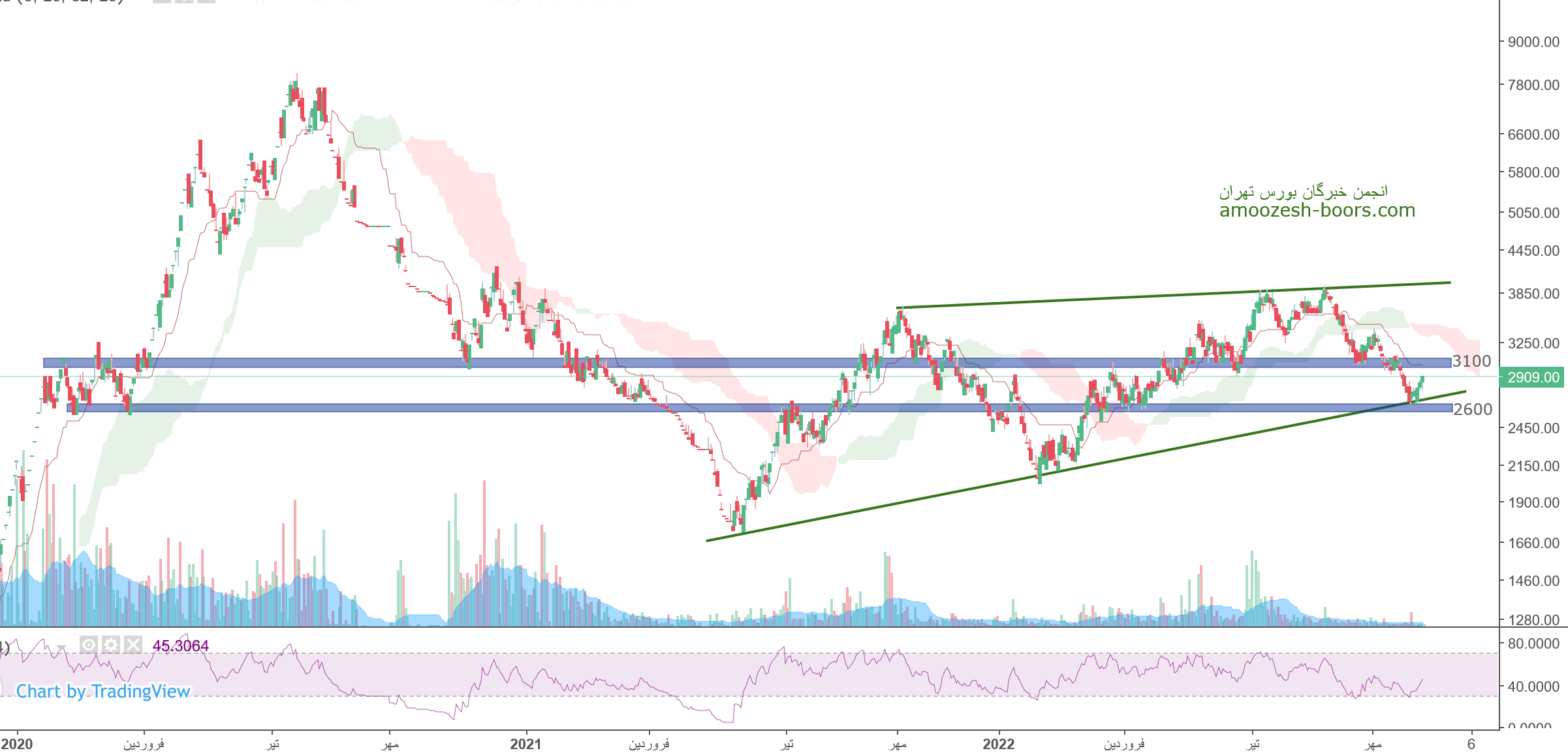 قیمت سهم خریخت در قالب یک کانال صعودی در حال رشد می باشد اما اکنون توانست مقاومت سقف کانال را بشکند با توجه به اشباع فروش در اندیکاتور امکان برگشت مجدد به درون کانال می باشد لذا در صورت بروز این اتفاق حمایت بعدی سهم خریخت حمایت ناحیه ۳۶۰ تومان در نظر گرفته خواهد شد همچنین در صورت تایید پولبک و رشد، مقاومت بعدی سهم خریخت تاریخی ناحیه ۶۳۰ تومان تعیین خواهد شد.