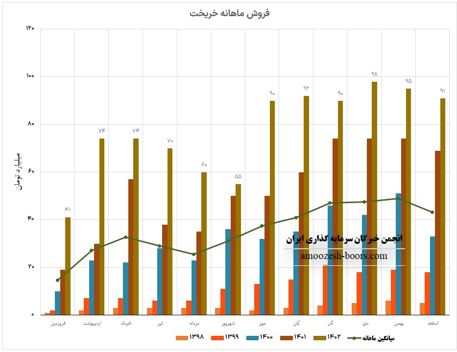 سهم خریخت در اسفند ماه حدود 1076 تن از محصولات خود را به فروش رسانده که این میزان در مقایسه با حجم فروش ماه گذشته خود حدود 31% کاهش پیدا کرده است.