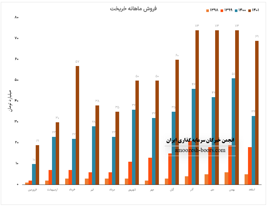 سهم خریخت در اسفند ماه حدود 1440 تن از محصولات خود را به فروش رسانده که این میزان در مقایسه با حجم فروش ماه گذشته خود حدود 10% کاهش پیدا کرده است.
