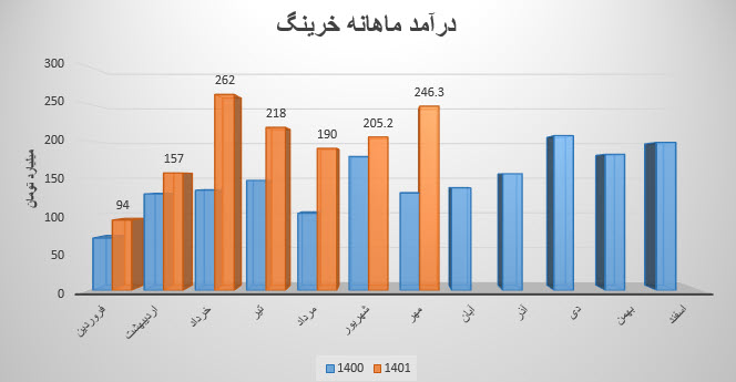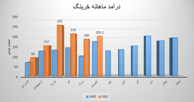 نماد خرینگ (شـرکت رینگسازي مشهد) در مرداد ماه ۱۴۰1 حدود مبلغ 190 میلیارد تومان درآمد داشته که این میزان در مقایسه با ماه گذشته 13% کاهش و همچنین در مقایسه با مدت مشابه سال گذشته 84% رشد درآمد پیدا کرده است.