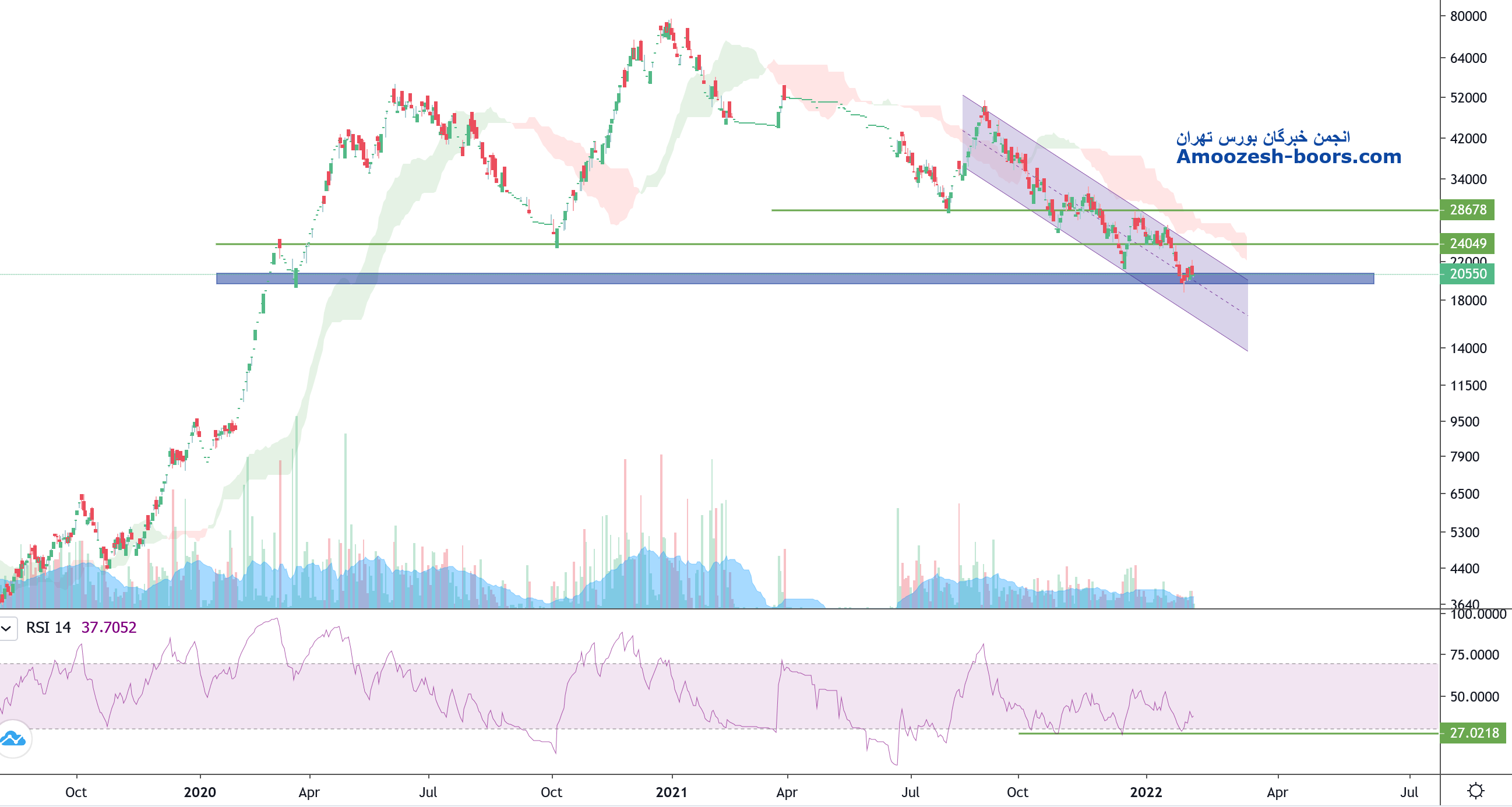 قیمت پس از خروج از کانال اصلاحی نزولی خود و برخورد به مقاومت محدوده ۲۱۰۰ تومان در حال پولبک به کانال شکسته شده میباشد که در صورت تایید پولبک و شکست محدوده مقاومتی ۲۱۰۰ تومان میتواند رشد خود را تا محدوده مقاومتی ۲۷۰۰ تومان نیز ادامه دهد اما در صورت عدم تایید پولبک و عدم وجود تقاضا قیمت اصلاح بیشتری کرده و مجدداً می تواند کف ۱۷۰۰ تومان را تست کند.