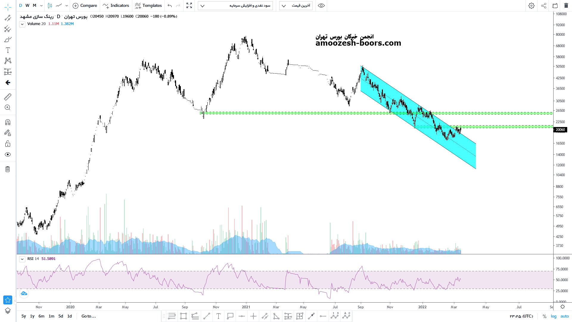 خرینگ با ایجاد واگرائی مثبت در محدوده حمایتی میدلاین کانال نزولی کوتاه مدت و همچنین حمایت استاتیک و روانی عدد رند 20000 ریال واقع شده است در صورت تثبیت مقاومت های 24000 و 28000 ریال بر سر راه سهم و درصورت ادامه فشار فروش اصلاح قیمتی تا کف کانال ادامه دار بوده و حد ضرر را فعال مینماید.