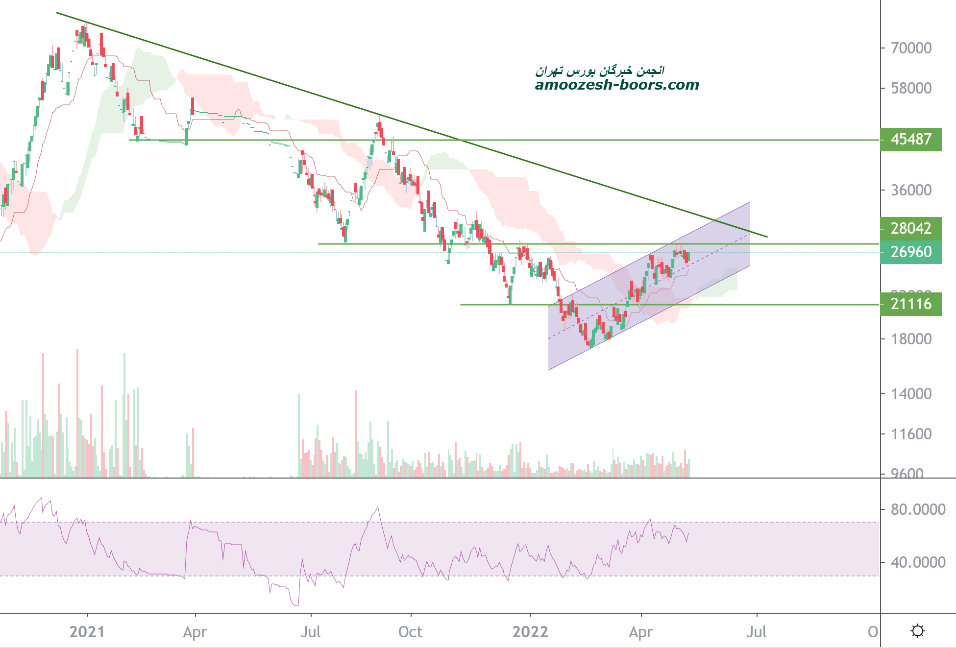 در حال حاضر قیمت در کانال صعودی کوتاه مدت درگیر مقاومت استاتیک شده است در صورت شکست این مقاومت،سهم سقف کانال و مقاومت داینامیک نزولی را بر سر راه خود دارد و در صورت اصلاح اولین و دومین حمایت سهم به ترتیب کف کانال و محدوده حمایتی استاتیک در قیمت 21000 ریال خواهند بود که در این صورت حد ضرر دوستان کوتاه مدتی فعال خواهد شد.