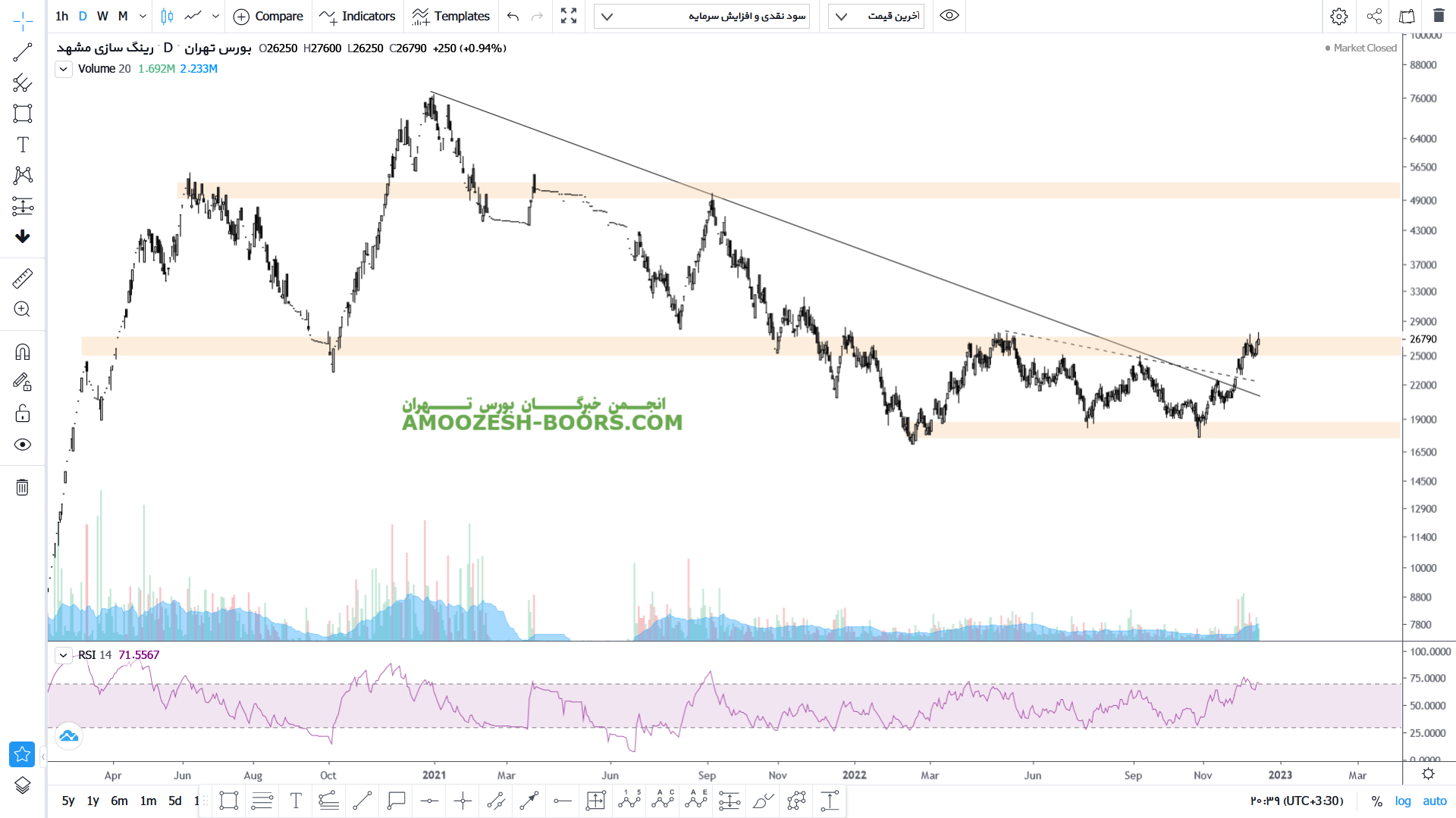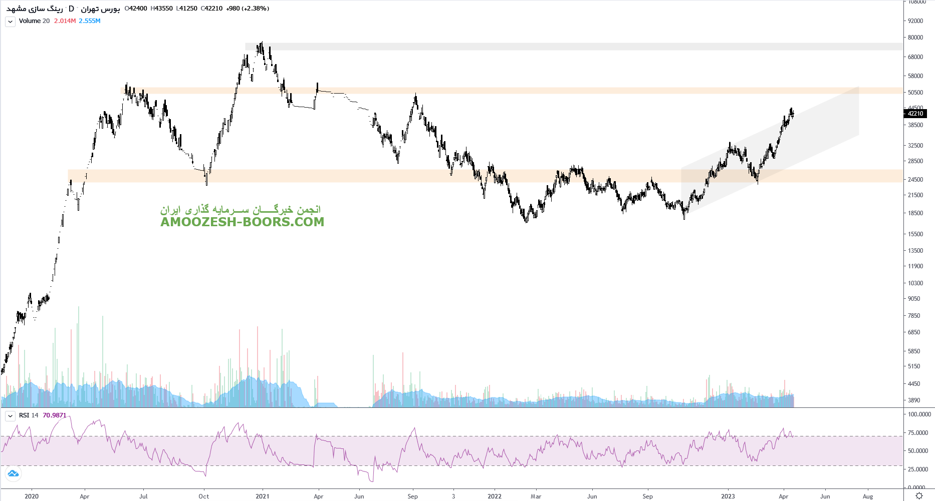 نماد خرینگ حمایت 24000 ریال را دارا میباشد، در صورت تثبیت قیمت روی این سطه حمایتی، حرکت سهم تا 28800 ریال دور از ذهن نخواهد بود، همچنین در صورت از دست رفتن این محدوده حمایتی، حمایت بعدی 20900 ریال در نظر گرفته خواهد شد.