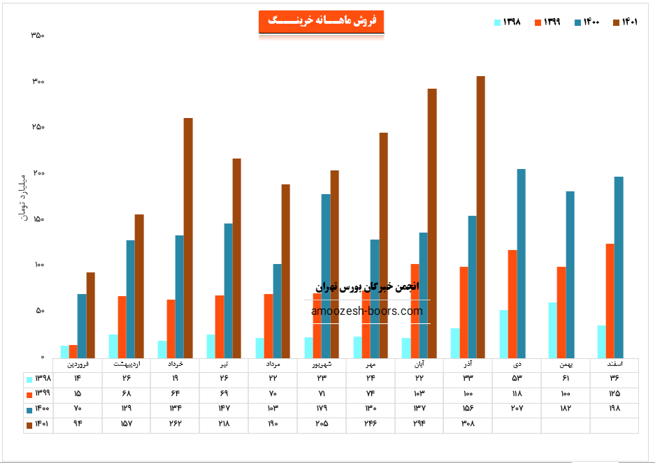 نماد خرینگ در آذر ماه حدود بیش از 489/300 عدد از محصولات خود را به فروش رسانده که این میزان در مقایسه با حجم فروش ماه گذشته خود حدود 3% کاهش پیدا کرده است.
