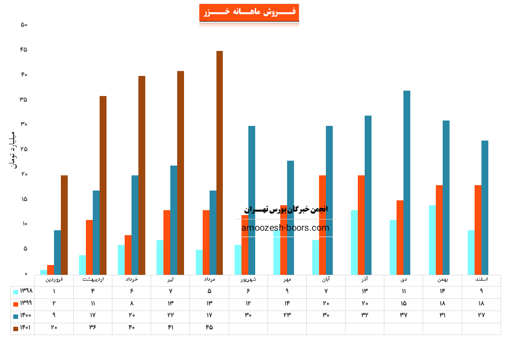 نماد خزر (شرکت فنرسازی زر) در مرداد ماه ۱۴۰1 حدود مبلغ 45 میلیارد تومان درآمد داشته که این میزان در مقایسه با ماه گذشته 10% و همچنین در مقایسه با مدت مشابه سال گذشته 165% رشد درآمد پیدا کرده است.