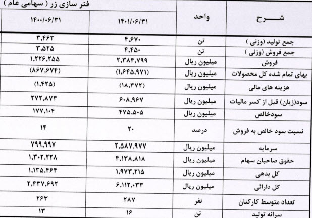 نماد خزر (شرکت فنرسازی زر) در دوره 6 ماهه منتهی به تاریخ 31 شهریور ماه 1401 به ازای هر سهم 184 ریال سود محقق کرده است که این رقم نسبت به دوره مشابه سال قبل (139%) رشد را نشان میدهد. همچنین سود خالص 139% رشد، سود ناخالص 106% رشد، سود عملیاتی 132% رشد و درآمدهای عملیاتی94 % رشد داشته است.سایر تغییرات بااهمیت دوره به شرح جدول پیوست میباشد :